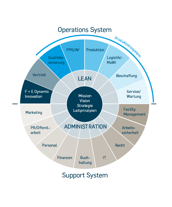 Der Lead to Lean® Ansatz von S + P umfasst das Unternehmen als Ganzes, denn ein nachhaltiger Erfolg wird erst durch die Durchdringung des gesamtem Unternehmens sichergestellt. Die Optimierung der Produktion mittels eines nach den sechs Lean-Prinzipien VALUE - FLOW - PULL - SIMPLE - ROBUST - SYNCHRONOUS ausgerichteten Produktionssystems ist oft der erste Schritt in der Transformation eines Werkes zu einer prozessorientierten Lean-Organisation. Dabei werden viele Rahmenbedingungen, die den Erfolg in der Produktion mitprägen, in anderen Verantwortungsbereichen gestaltet. Die Übertragung der Prinzipien des Produktionssystems auf eben diese Bereiche weitet das Produktionssystem zu einem Operations System aus. Hier sind insbesondere die Unternehmensbereiche Vertrieb, Auftragsabwicklung, Forschung und Entwicklung sowie Einkauf und Service bedeutsam. Ein aufeinander abgestimmtes Vorgehen und die integrative Entwicklung eines für Ihre Prozesse und Anforderungen spezifischen Operations Systems stellt die Implementierung eines durchgängigen und nachhaltigen Managementsystems für Ihr Unternehmen sicher.